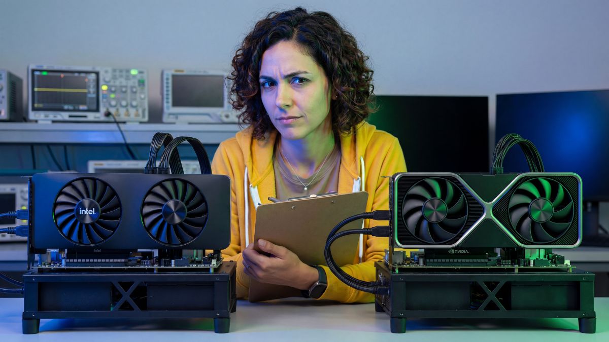 Elena Rodriguez comparing Intel Arc B570 and RTX 5060 on a test bench.